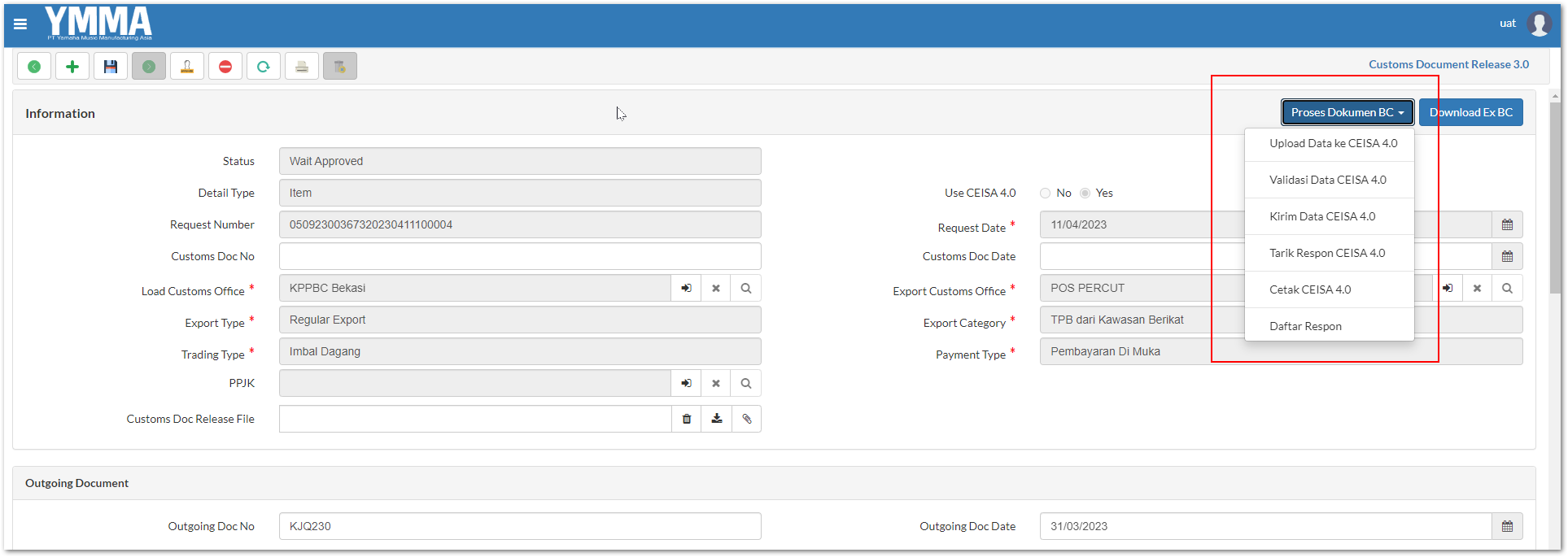 Setelah status berubah menjadi Wait Approved, pada pojok kanan atas akan terdapat tombol Proses Dokumen BC. Jika tombol tersebut diklik akan ada enam sub tombol lainnnya: