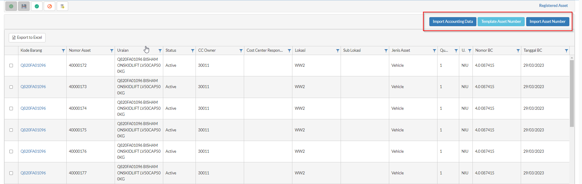 Pada menu Register Fix Asset, sudah disediakan tombol import data Accounting, untuk mengisikan nomor Asset
