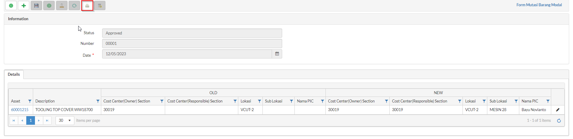 Berikut ini adalah tampilan dari dokumen Form Mutasi Asset, lalu User bisa klik print untuk mengeluarkan formatnya